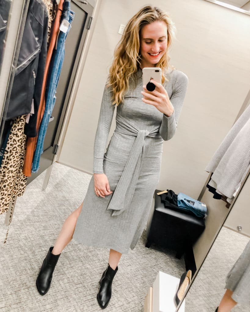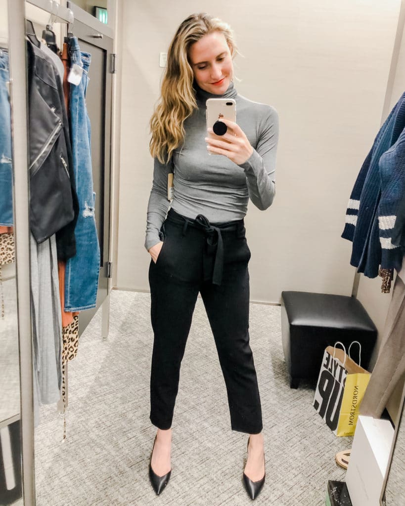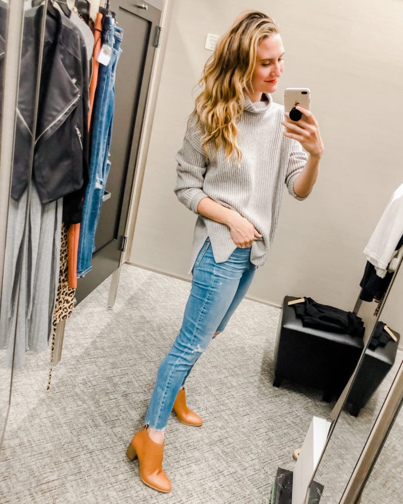 Grey Long Sleeve Turtleneck (Sale price: $24; $39 after sale) – Okay, if you don’t have a long sleeve turtleneck, the time is now. This top is one of the most versatile pieces you can own for cool months, and this one is crazy-comfortable in stretch knit. Also comes in white and black. Wear it on its own, or layered with something like a cardigan or even chunky sweater! Sizing notes: Wearing a small, fits true to size.