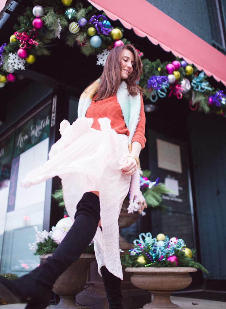 …While you’re out there going for it, may I suggest pairing a cute sweater with a midi skirt (Shop adorable finds here!) and over the knee boots this winter? I love this combination for cooler temperatures because it’s a great way to bring winterized style to a look that is typically reserved for Spring. A little style trick I’ve been doing lately is adding a simple bandana to sweaters – it’s so easy and yet brings just the right amount of classic style! Throw a chunky scarf over your shoulders, too, because especially in the winter…more is more!