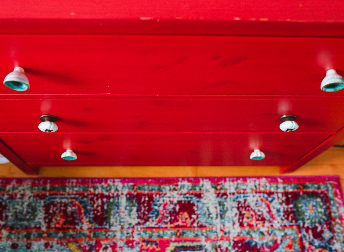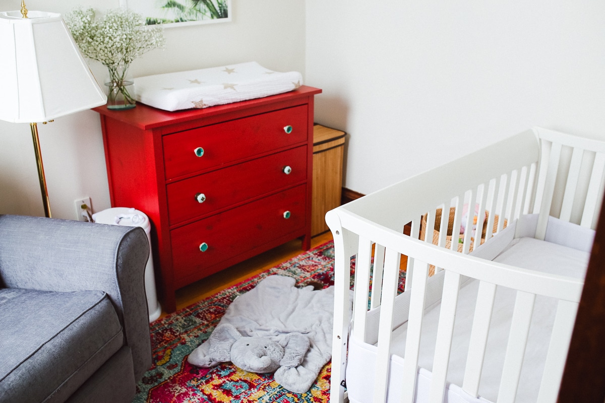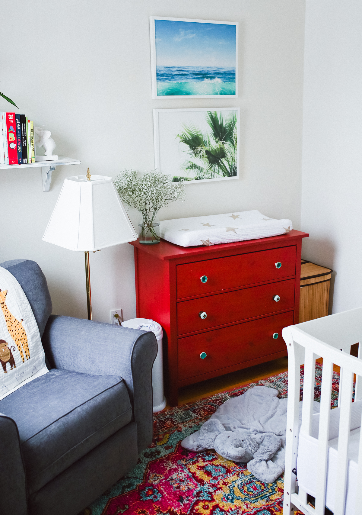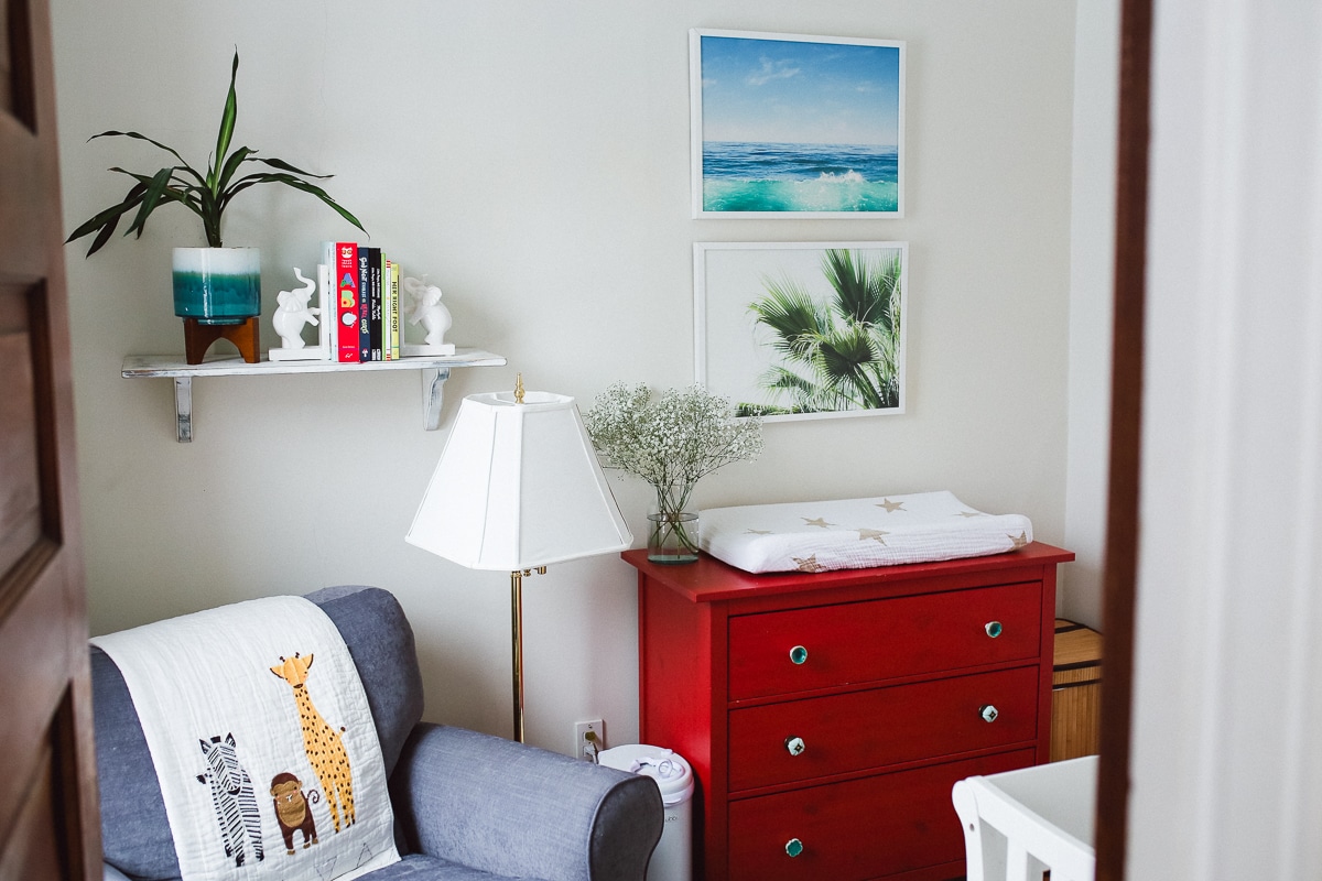 Doug found it online, and given it was a major steal, he surprised me with it for the baby’s nursery. (This was back when we were still undecided on names!) I saw it as an exciting design challenge: how would I make a red dresser work well in the same space as the grey/blue glider we already had, and have it not look American flag themed? (Too many whites or neutrals could have easily made it go that route.) My solution: add more color to the mix.