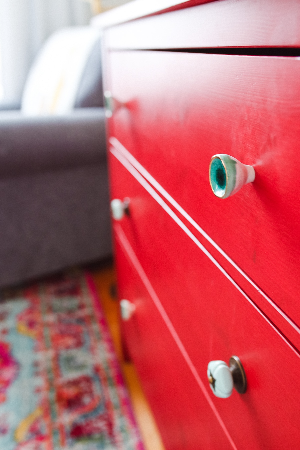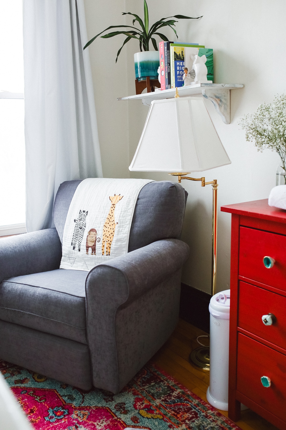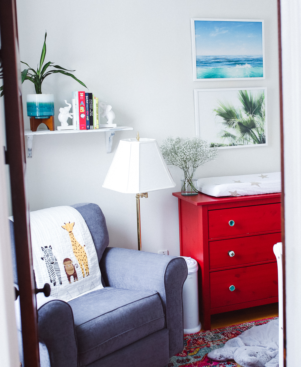 Doug found it online, and given it was a major steal, he surprised me with it for the baby’s nursery. (This was back when we were still undecided on names!) I saw it as an exciting design challenge: how would I make a red dresser work well in the same space as the grey/blue glider we already had, and have it not look American flag themed? (Too many whites or neutrals could have easily made it go that route.) My solution: add more color to the mix.