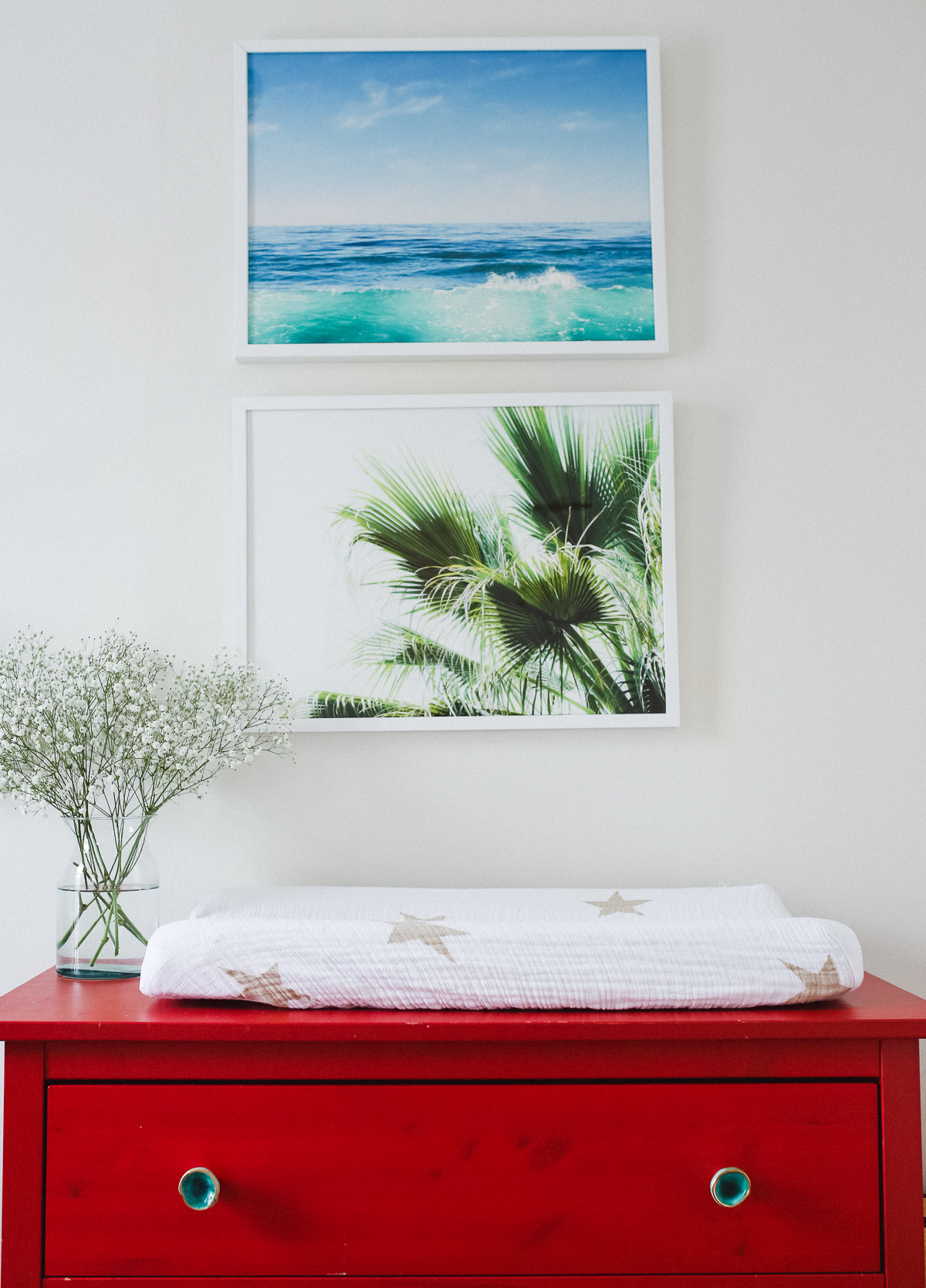 I’ve always loved a bohemian twist, whether it be in home decor or personal style, and so putting together a nursery themed as such was fun. My favorite parts of course include the red dresser with the turquoise knobs because it’s such an unexpected decor twist for a nursery, but I’m equally in love with the palm leaf and ocean water prints from Minted, which help pull together the room and no doubt will work anywhere in the house down the road.