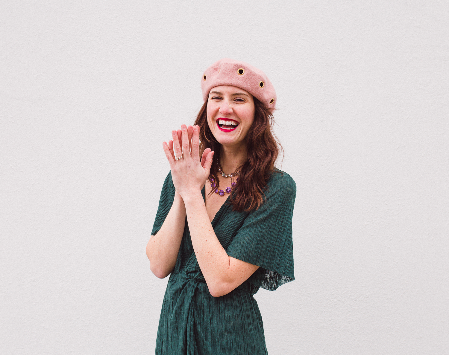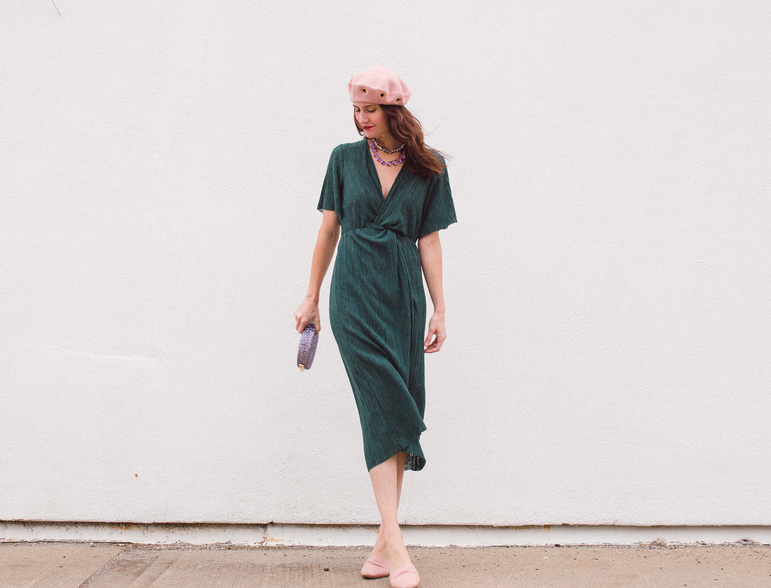 Dress: Nordstrom in-store, but gah – was not able to find it online! However, here are some emerald dress options that would be so pretty for a holiday party: ASTR The Label Lace Midi Dress (Comes in a ton of cute colors and is very flattering on!) + Reformation Piper Dress + Eliza J Fit & Flare Sweater Dress. If you are open to colors outside of emerald, here are some additional lovely options: Halogen Bow Back Shift + Topshop Plain Satin Slipdress + Reformation Alma Dress (LOVE the leopard print!) | Hat: Wool blush beret. Similar here + here.| Purse: Natasha Glitter Clutch. How fun is this purse?! It also comes in gold and blue!| Necklaces: Layered the Lydia Statement necklace with the Micaela Erlanger choker necklace. Love this necklace as a layering option, too! | Shoes: Everlane mules. The ones shown are past season and no longer available, however the Editor Slingback flats are similar!