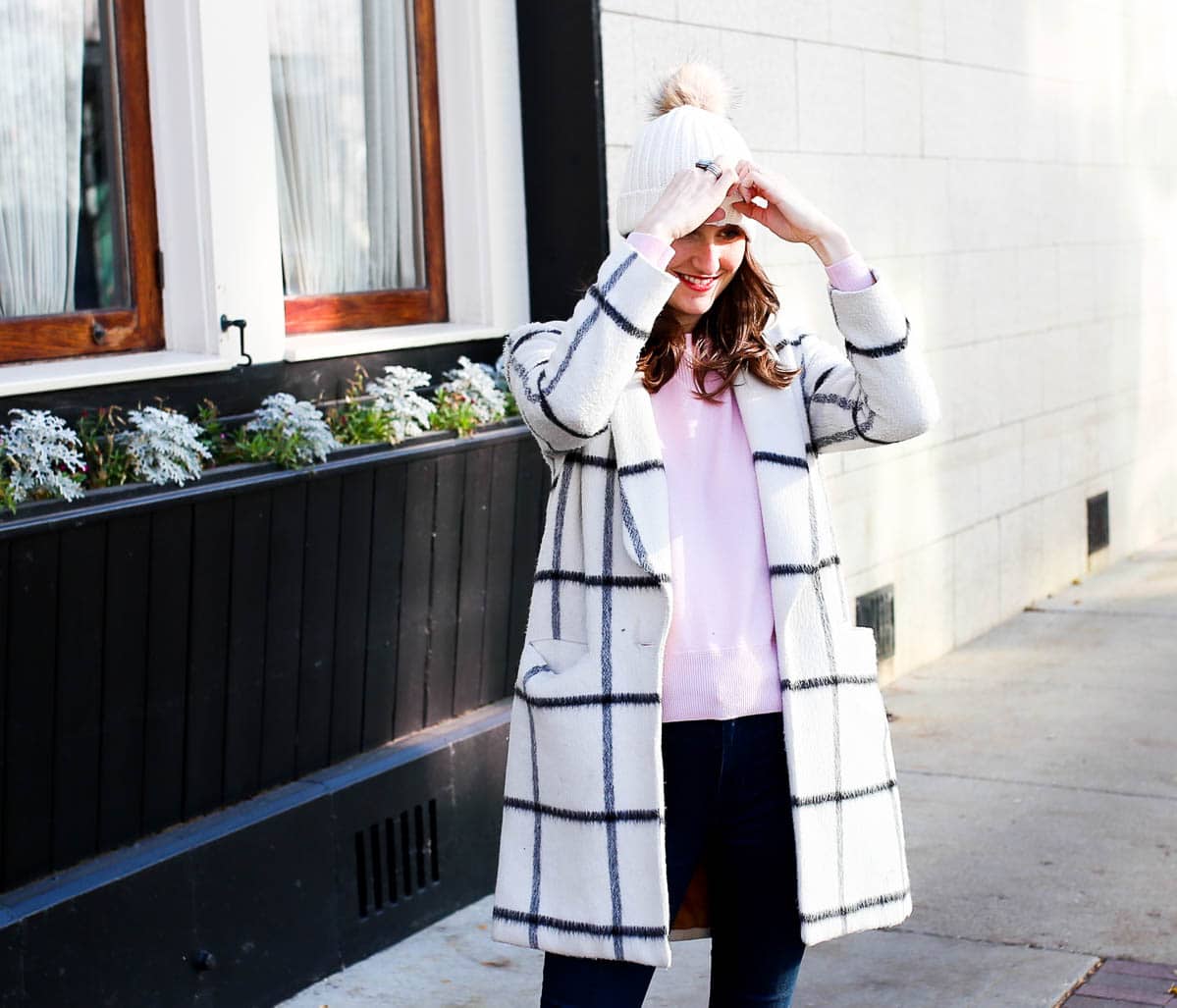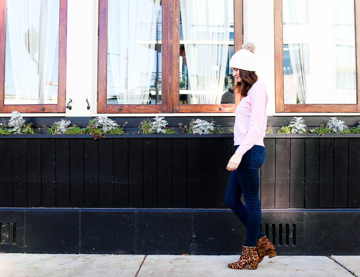 Sweater: 100% Cashmere Crew Sweater | Booties: Leopard print block heel booties. I love this pair’s pointed toe! | Jeans: Hudson high waist skinny jeans | Hat: Ribbed beanie with faux fur pom pom | Coat: Past season. Similar find here!