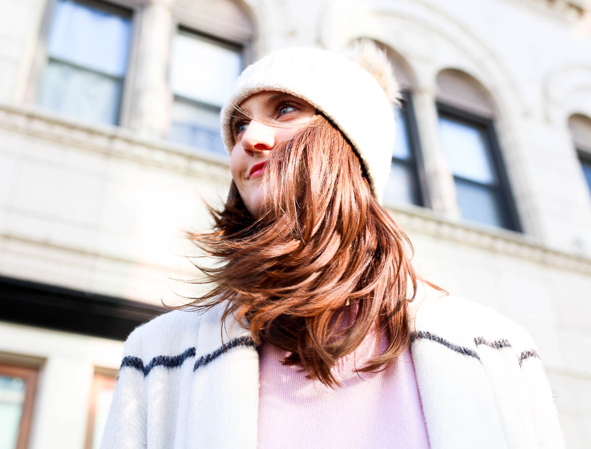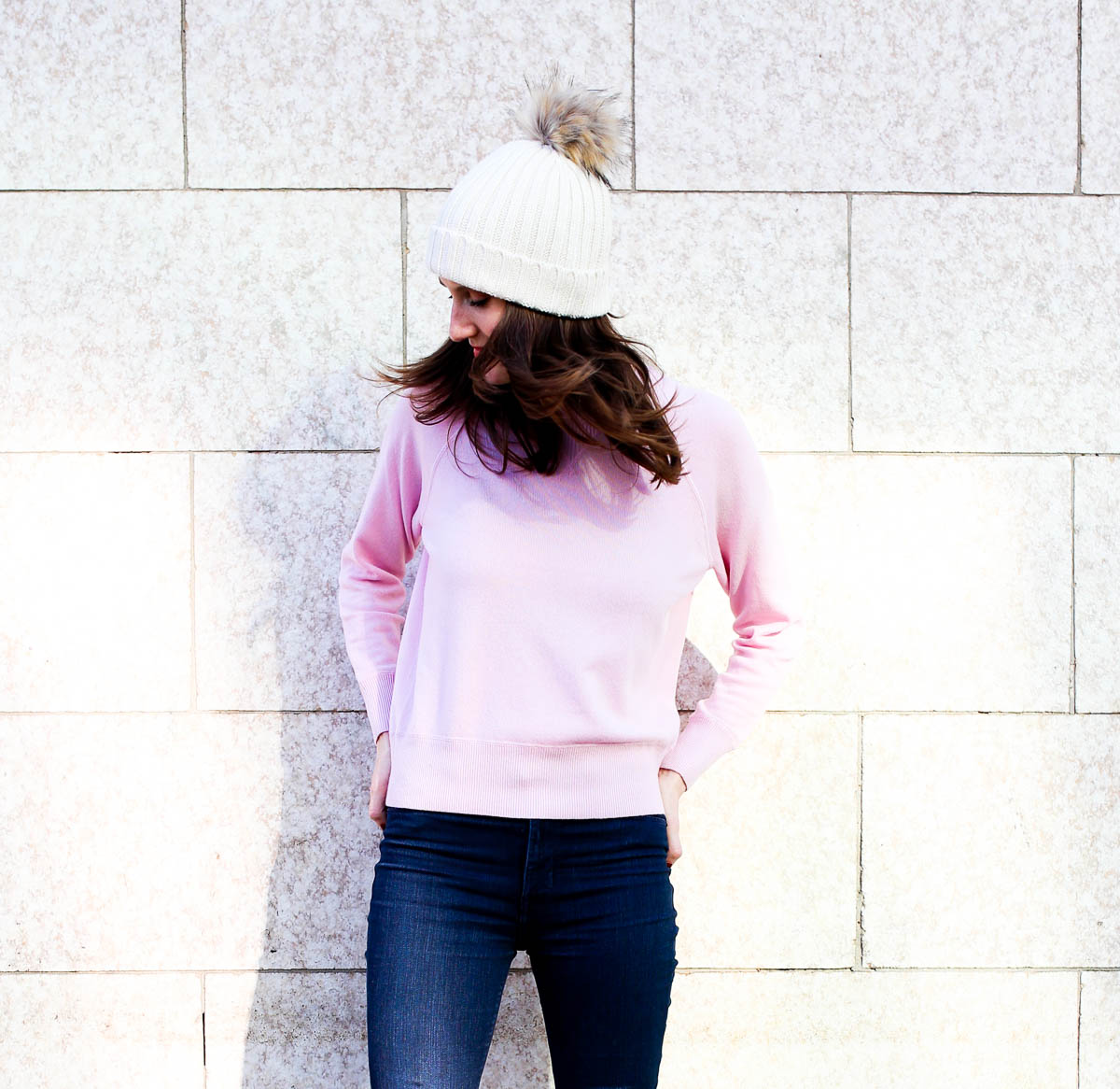 Allow me to break it down for ya. First, this Everlane 100% cashmere sweater is everything. (Only $100 – would make a great gift!) I opted for it in what’s becoming my signature color, soft pink, but it comes in a ton of options including black, blue, white, red and multicolored. It’s super soft and is a relaxed fit, making it perfect for layering or wearing on its own with a great pair of jeans. I paired it with one of the season’s most popular hats, this ribbed beanie faux fur pom pom hat. (One of my favorite purchases from Cyber Monday. I maaaay have bought a few of these for presents, and also one for myself. Whoops!)