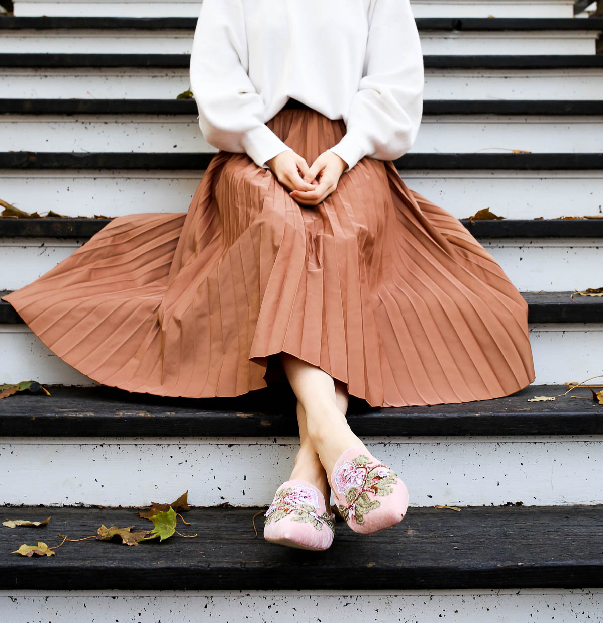 I wanted to share this outfit combination with you because it’s a great option for Thanksgiving day. It’s chic, yet comfortable, and is a delightfully unexpected way to wear a few closet staples that you no doubt have. Simply tuck a sweater into a midi skirt, pair with flats, booties or heels, and wear the combination with confidence. I promise you’ll get lots of compliments!