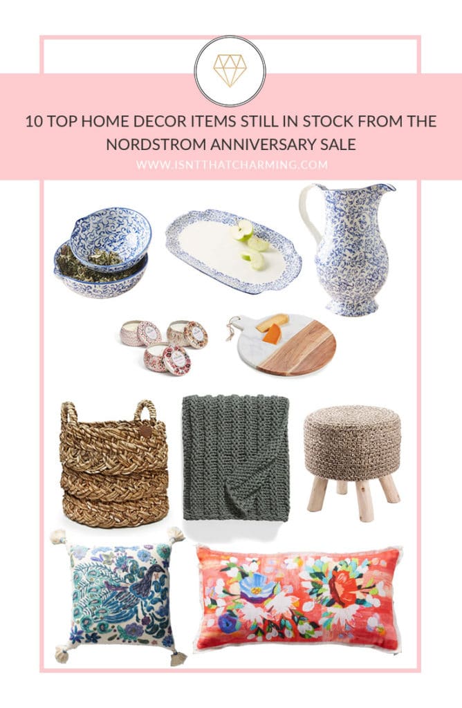 Anthropolgie Attingham Measuring Cups ($17; after sale $28) – The perfect meal prep assistant! | Anthropologie Attingham Platter ($44; after sale $68) – Can’t you just see a dinner party with this serving some appetizers?! | Attingham Pitcher ($37; after sale $58) – The perfect items to pair with the platter. **I already have all three of these items in my shopping cart – I adore the blue and white designs. So full of charm! | Voluspa Tin Candles – Comes in a pack of 3 ($32; after sale $48) – These smell amazing and also make the perfect gifts! | Round Marble & Wood Serving Platter ($49; after sale $79) – Very West Elm, eh?! Loving the mix of marble and wood.| UGG Peppermint Grove Round Basket ($185; after sale $248) – From blankets to toys, this would be perfect in any living area. | Jersey Rope Chunky Knit Throw ($65; after sale $99) – The perfect companion for snuggle weather! | Jaipur Pour Stool ($95; after sale $129) – Love this for the kiddos! I can see this in rooms like our living room and sunroom to have a casual place for the girls to sit. | Embroidered Peacock Accent Pillow ($49; after sale $78) – Adore the rich hues of this pillow and the peacock design! | Liv Floral Accent Pillow ($57; after sale $88) – Oh my gosh the COLORS! This makes my heart sing.
