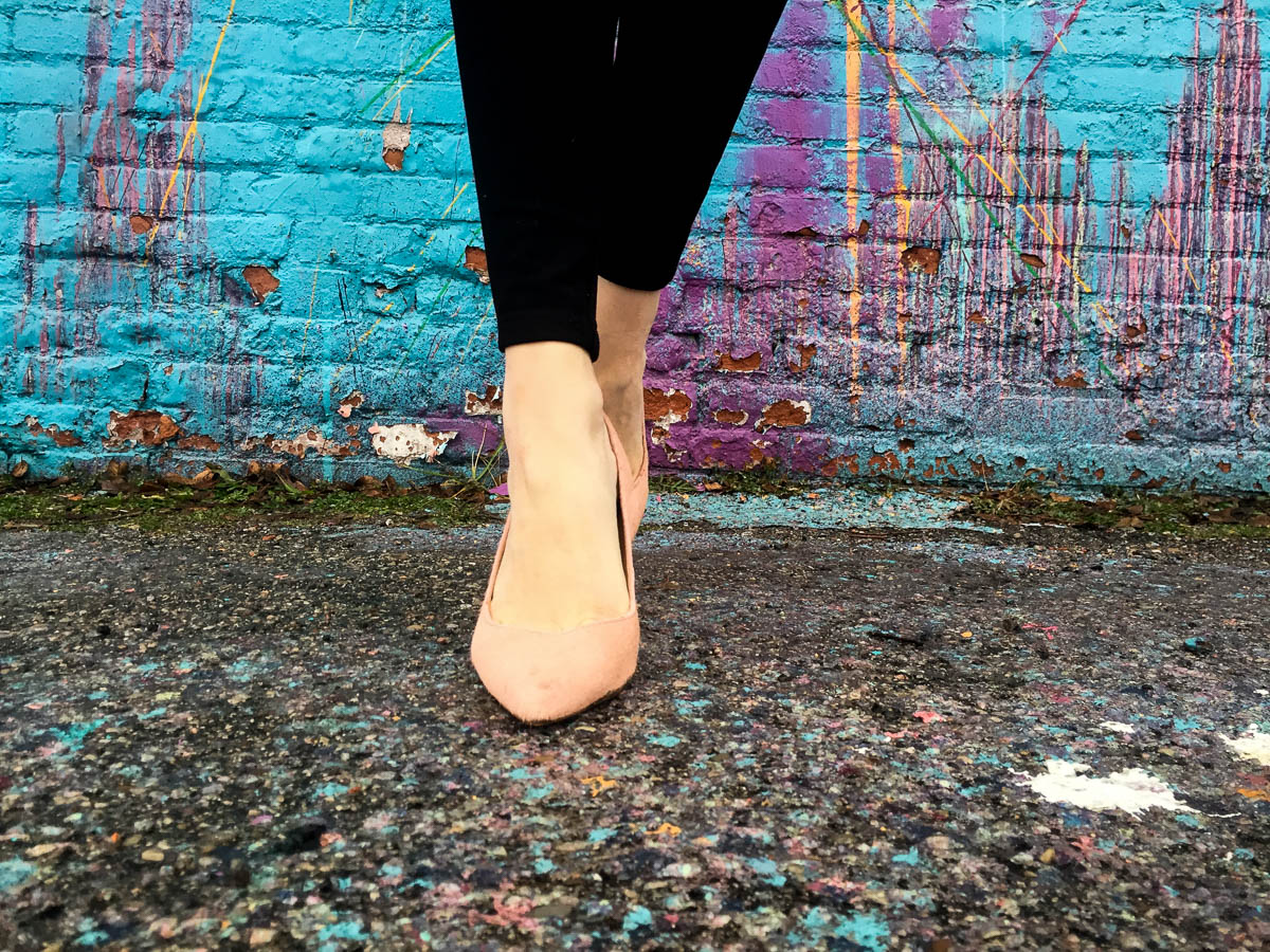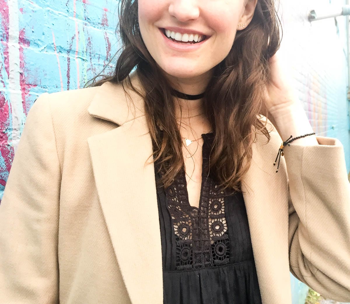Psst – These photos were taken in front of the amazing Illuminated mural in Detroit while we were at home. All we had were our iPhones, so ignore any graininess, but how gorgeous is this wall?! I’m wearing blush Banana Republic pumps, tiered lace shirt from Anthropologie (Love that it works with my growing preggo belly), and a camel trench coat (Similar here & here).