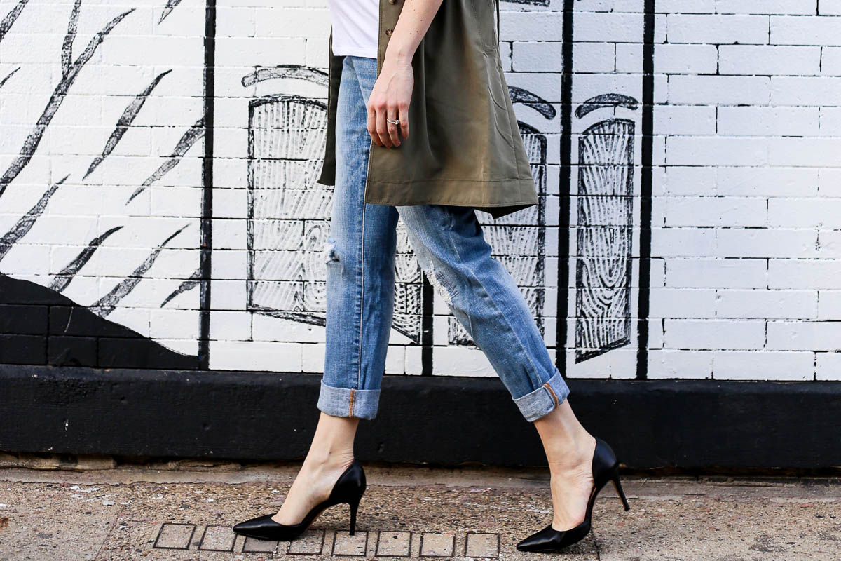 …Back to the dress. I love the classic silhouette of this, and equally love that I could easily wear this unbuttoned and layered, too. I paired it with distressed jeans (maternity options here), the most comfortable white t ever, black pumps, and the coolest rose gold layered chain necklace. (Another item that’s proven to be extremely versatile and adaptable!)