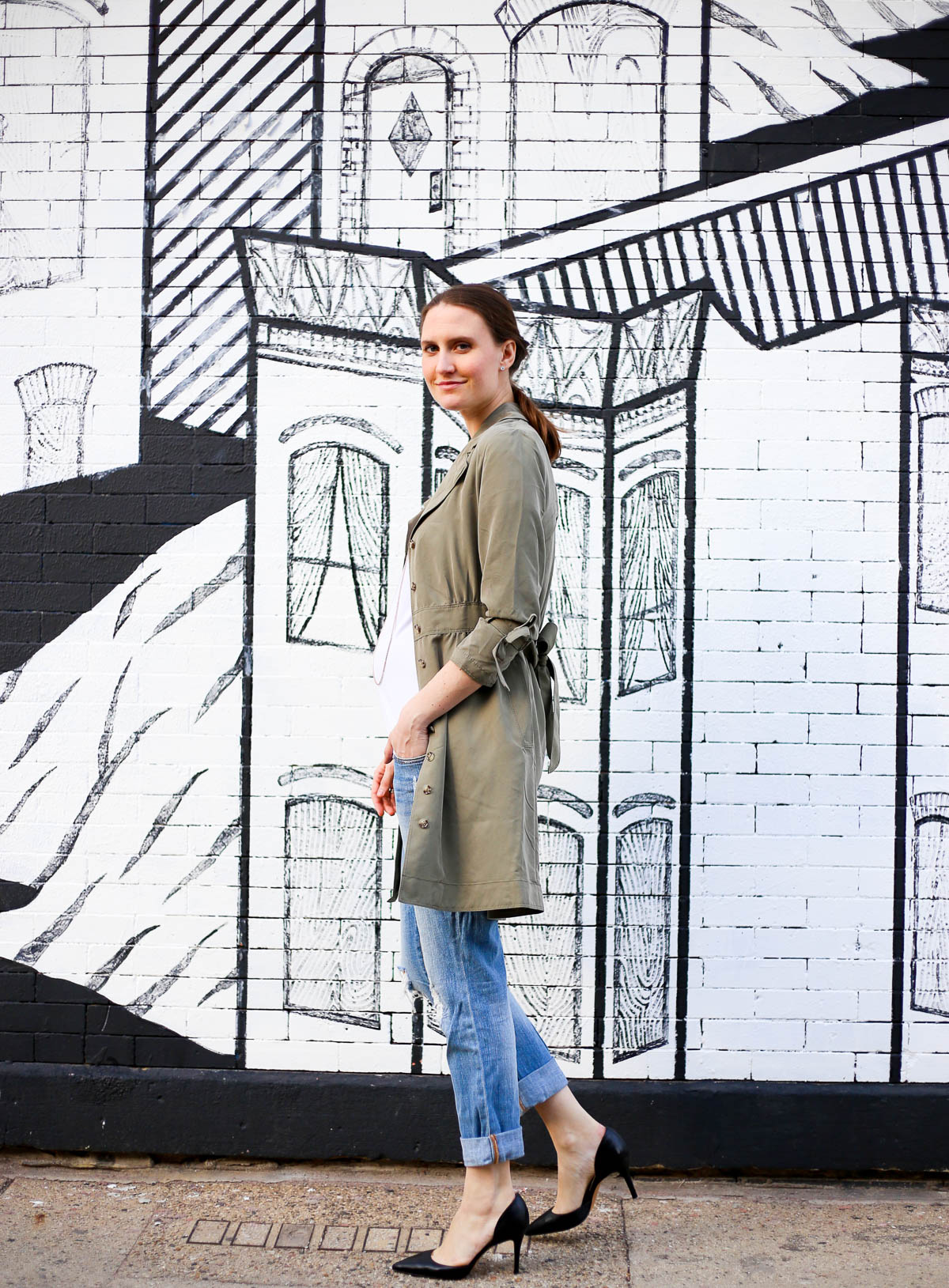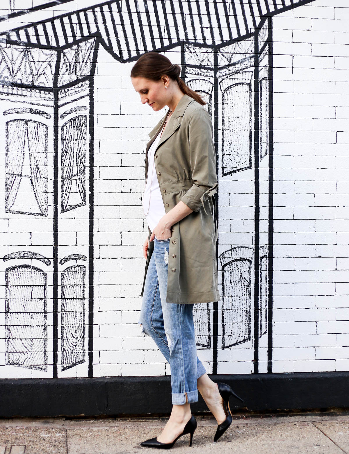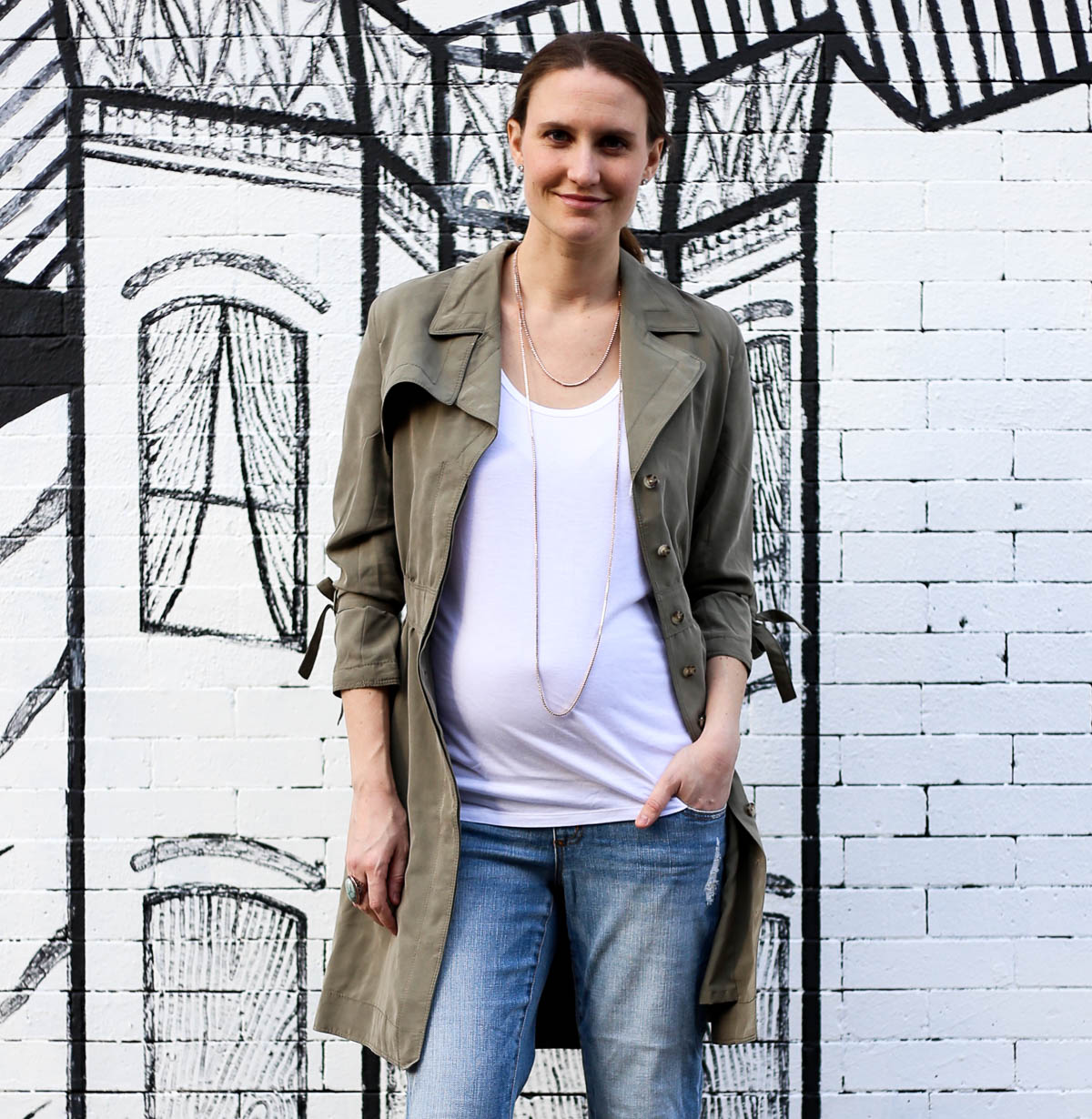 In this case, I wore an olive green, long sleeve trench dress, and was giving myself a little pat on the back for the end result. Why? Lately I’ve been toying with wearing clothes in new ways – when you’re pregnant and rebelling against buying maternity, you gotta think outside the box! Sometimes my ensembles work, and others I end up looking like a strange land-trapped whale (Images not shown for consideration of the viewers). So, when I find a look that embraces the belly in a nice way, it’s cause for celebration.