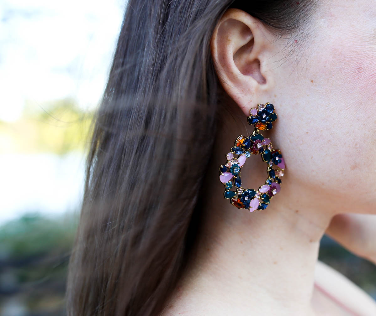 Dress: ASTR The Label lace midi dress. Probably one of the best finds of the season – it comes in 5 different colors including this beautiful “Coral Cedar”, and is under $100. | Heels: Cranberry velvet pumps from last season. These are almost identical, and here are similar finds that are flats. | Coat: Vintage, however this one is very cool and a great price, too. | Earrings: Colorful floral hoops in “Dark Ink”.