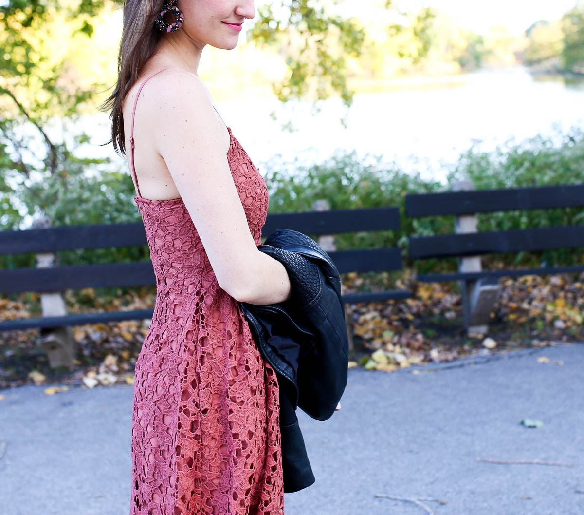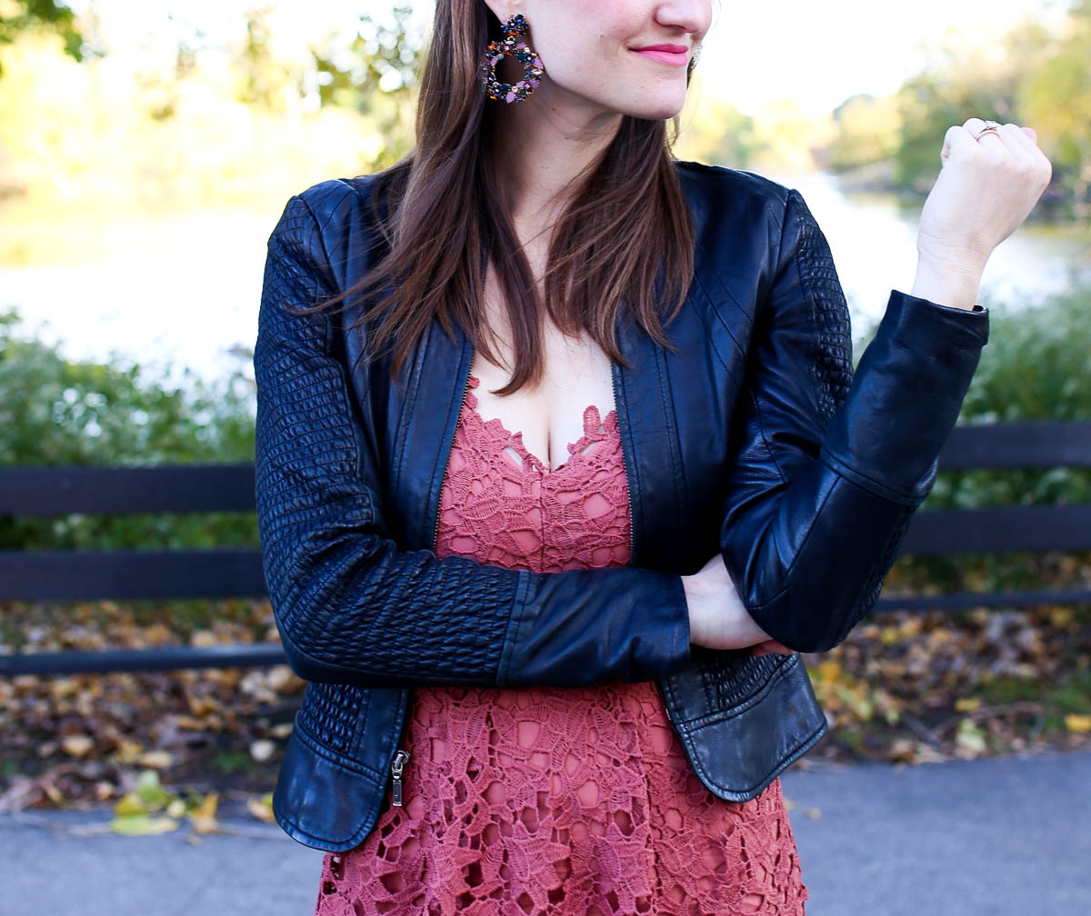 In the meantime, if the words “sweet, playful and ready to party” describe you, I’ve got the perfect dress for your holiday gatherings. It’s a very comfortable, flattering lace midi dress, and it comes in 5 different colors including “Coral Cedar”, which embodies fall perfectly. And guys, it’s under $100! Guilt free, especially with all the present shopping you’re sure to be doing in the pending weeks. I paired it with my leather coat to make it less dressy since I wore this for a day outing, but I also love it paired with a classic trench coat, too.