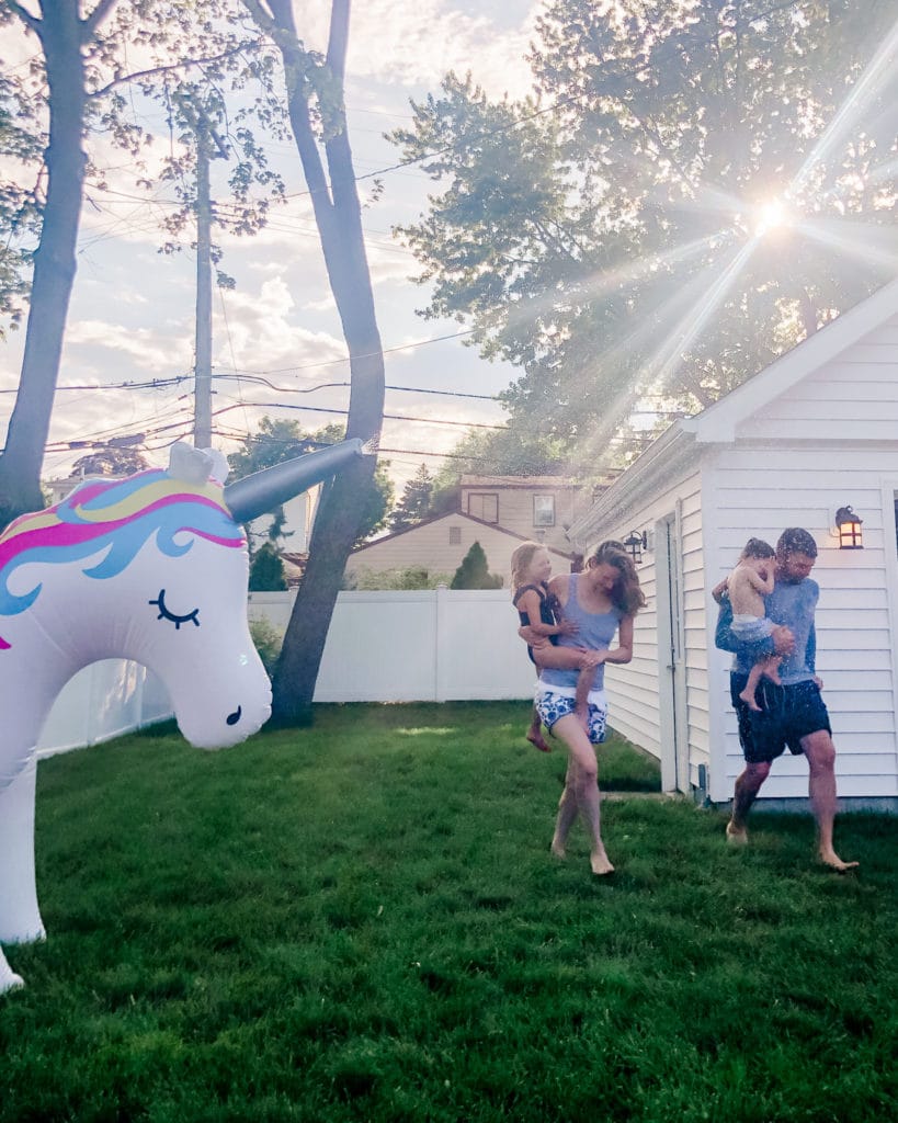 - Celebrating Grace’s 4th birthday. She got a huge, blow up unicorn that sprayed water from its horn that took over our backyard for most of the summer. The girls loved it; Doug and I merely tolerated it. (Note the image below – it was seriously huge – Ha!)
