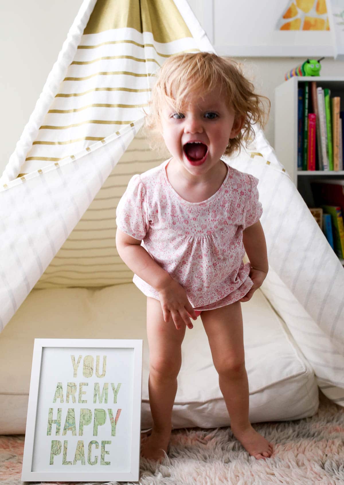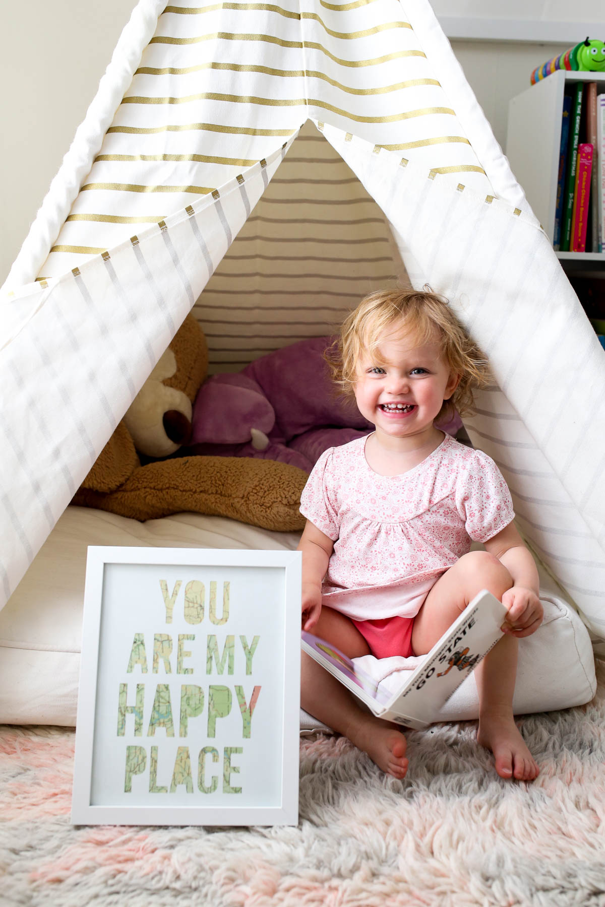 Grace’s teepee – or her “Reading tent” as she calls it – was a gift from my amazing friend Jessica. It can be purchased here!