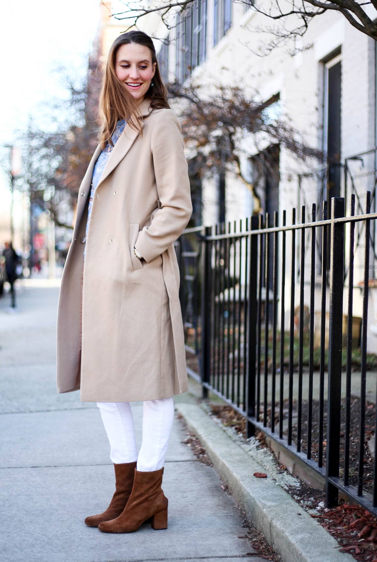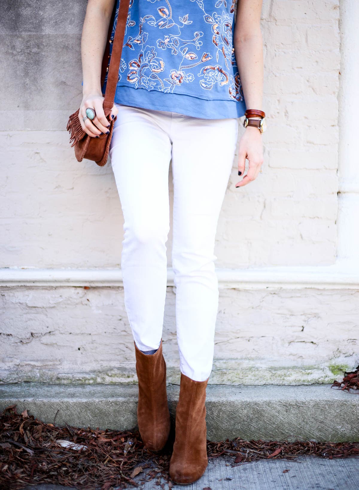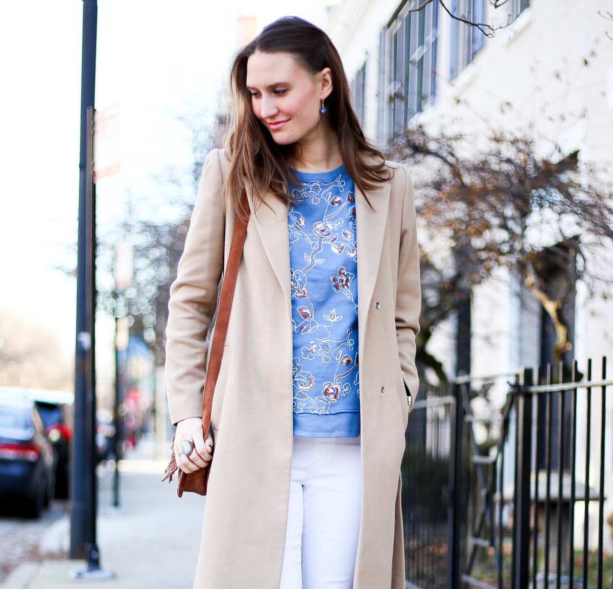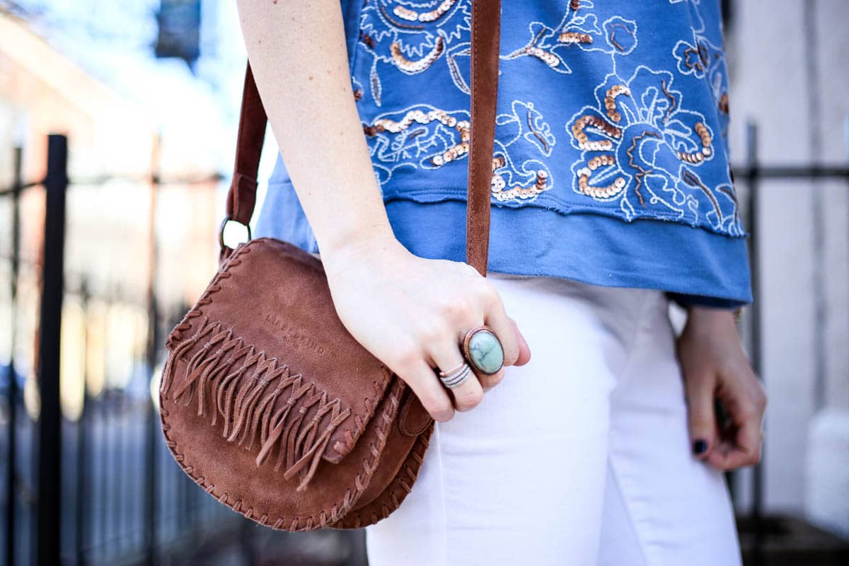 Here, I’m wearing the most darling sequin embroidery sweater; I love the delicate, feminine pattern and blue hue. It makes for a perfect winter and spring addition! It’s non-maternity but still works for a growing belly, so that’s a huge win, too. I love looks that are intentionally relaxed, they’re sliming and perfect for dressing up or down. On this day, I paired my sweater with a camel trench (Similar here & here, and this option is 50% off right now), white jeans (non-maternity option here), Free People booties (SERIOUSLY obsessed with these – they’re so comfortable and go with everything), and crossbody fringe bag (Mine is old but this option is even cuter!)