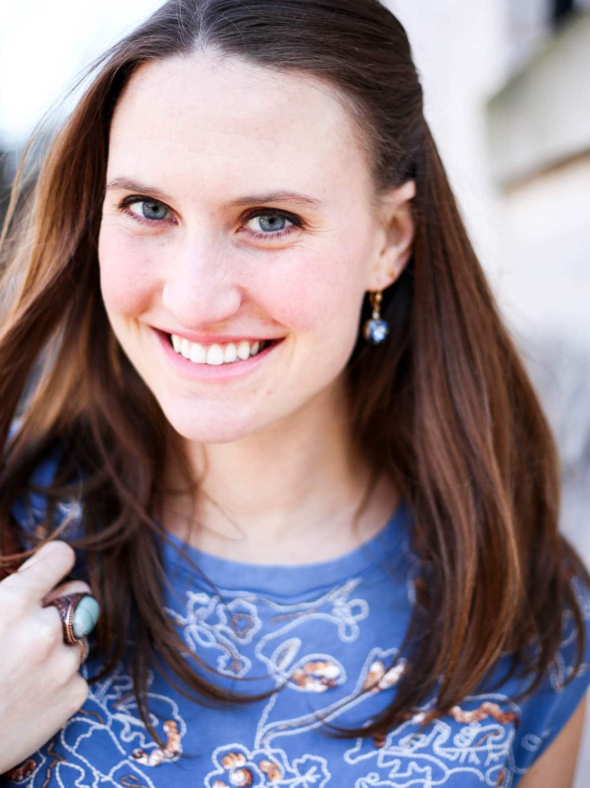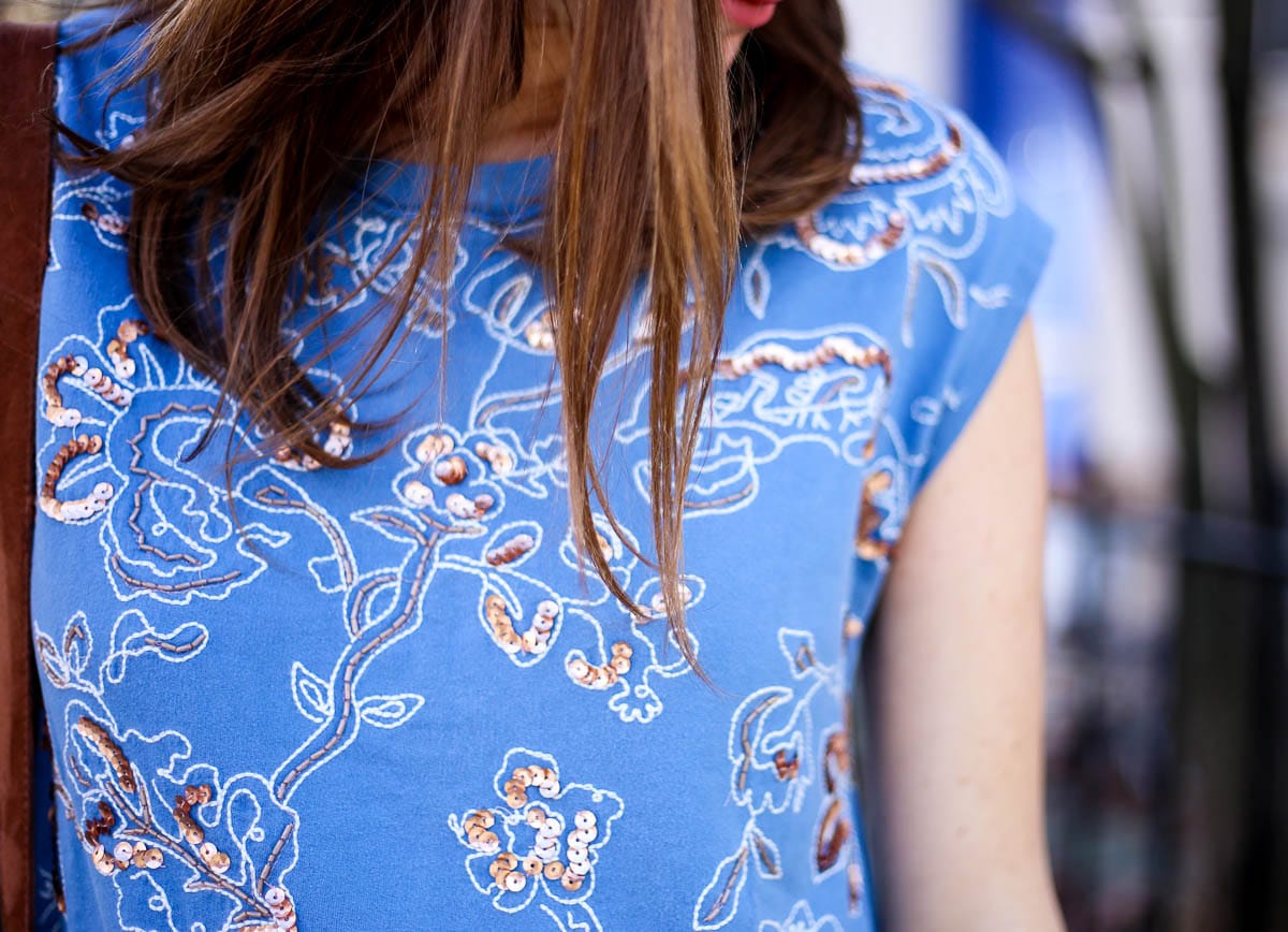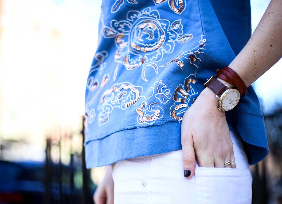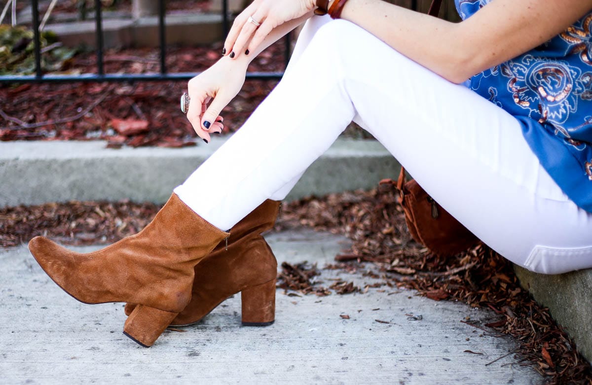 Here, I’m wearing the most darling sequin embroidery sweater; I love the delicate, feminine pattern and blue hue. It makes for a perfect winter and spring addition! It’s non-maternity but still works for a growing belly, so that’s a huge win, too. I love looks that are intentionally relaxed, they’re sliming and perfect for dressing up or down. On this day, I paired my sweater with a camel trench (Similar here & here, and this option is 50% off right now), white jeans (non-maternity option here), Free People booties (SERIOUSLY obsessed with these – they’re so comfortable and go with everything), and crossbody fringe bag (Mine is old but this option is even cuter!)