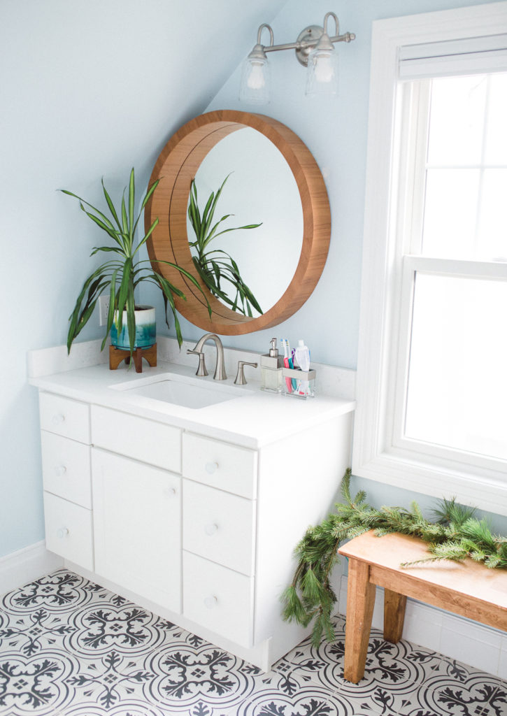 Progress: After a ton of trial and error, we found a mirror that we like! We also have somewhat set up this bathroom to be how we want. I just have to say here that I am OBSESSED with this tile and love it more every day.