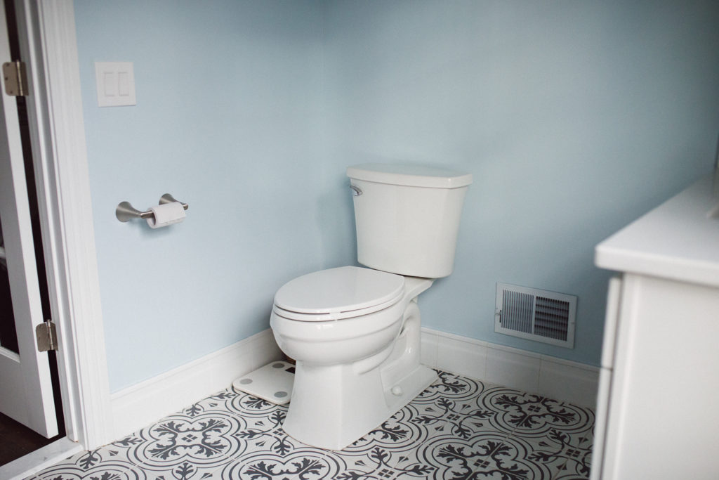 To-Do’s: All artwork hung on walls. Potentially a new rug with more personality. Need blinds on the french doors. (Er…it’s currently awkward when you have to go to the bathroom, ha!) Need to get a new light and then figure out what we want to do with the lighting situation — the current light being uncentered on the mirror is driving me nuts.