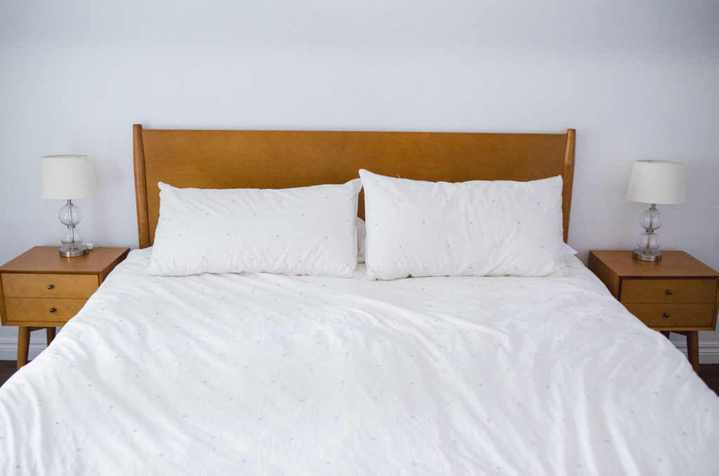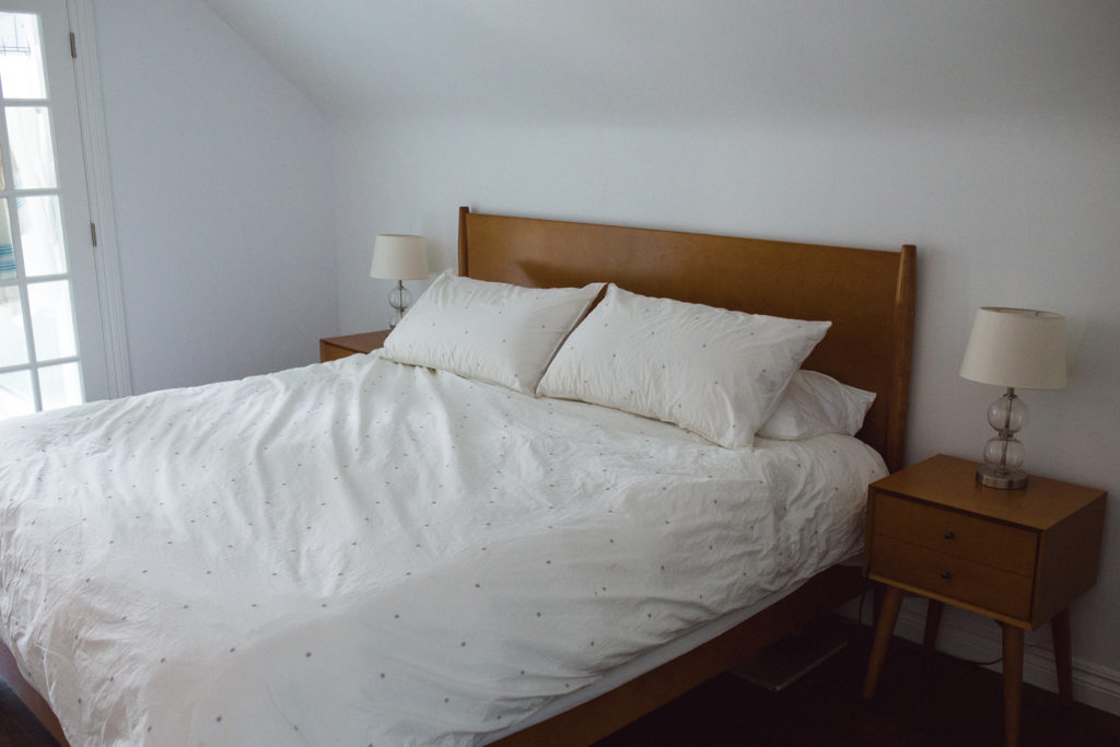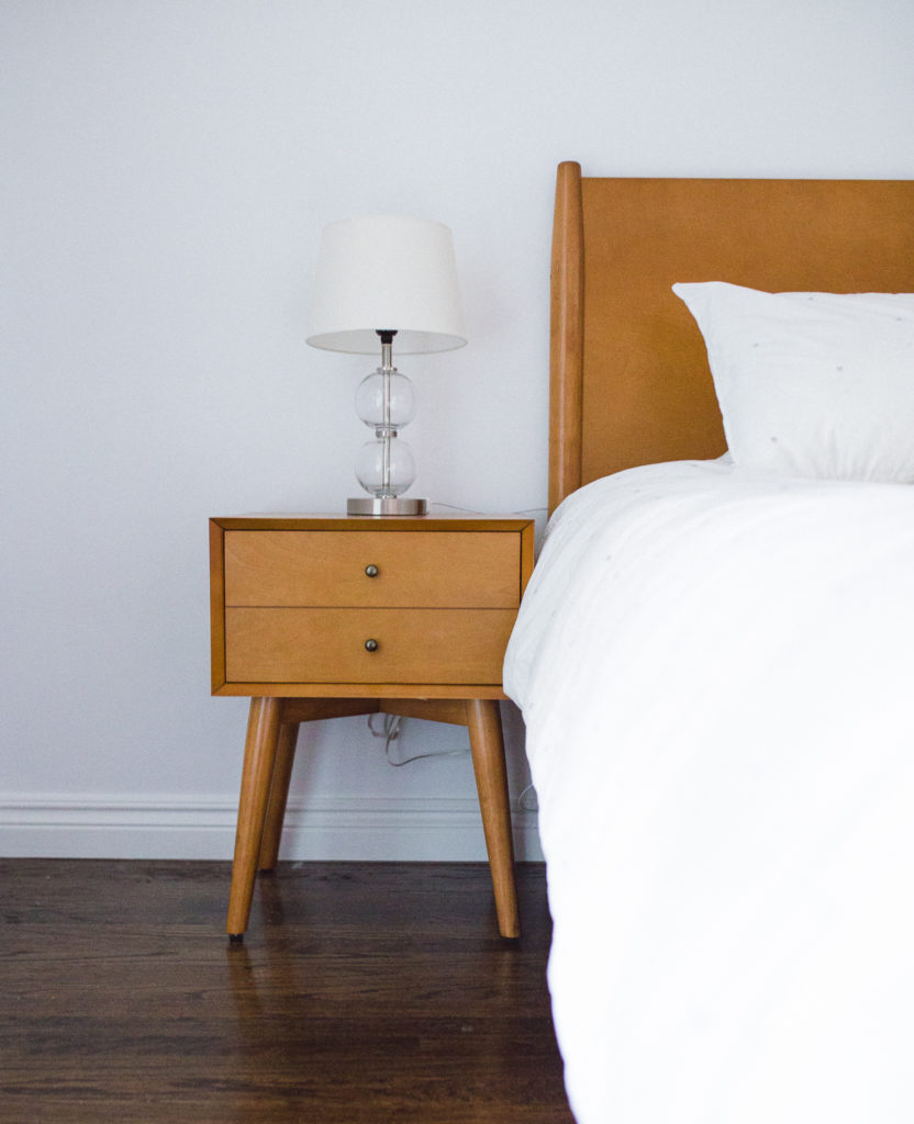 Progress: We bought our first king-size bed ever! Our Chicago apartments were so small that none could physically fit that size bed, so we were crazy excited about finally being able to have a king. To match, we bought new nightstands. All mid-century modern in style! And, we recently purchased a new dresser.
